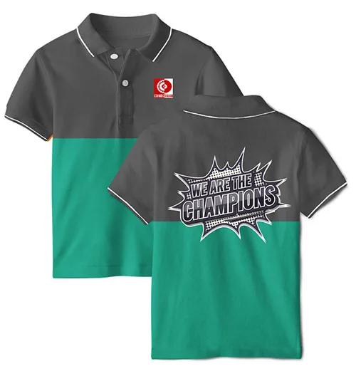 Kiểu dáng: Áo polo cổ bẻ truyền thống, tay ngắn, phần thân áo được thiết kế phối màu, tạo điểm nhấn cá tính. - In ấn: Mặt trước áo thường được in logo hoặc biểu tượng của nhóm, mặt sau in dòng chữ “We are the champions” với font chữ nổi bật, khẳng định tinh thần chiến thắng.