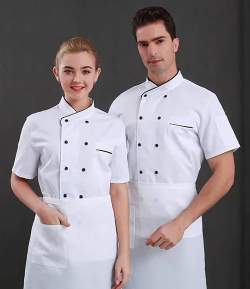 Màu trắng là biểu tượng của sự sạch sẽ và tinh khiết, rất phù hợp với môi trường bếp nơi yêu cầu vệ sinh nghiêm ngặt. Màu trắng cũng giúp làm nổi bật hình ảnh chuyên nghiệp và tạo cảm giác gọn gàng, ngăn nắp cho đội ngũ nhân viên bếp. - Chất liệu: