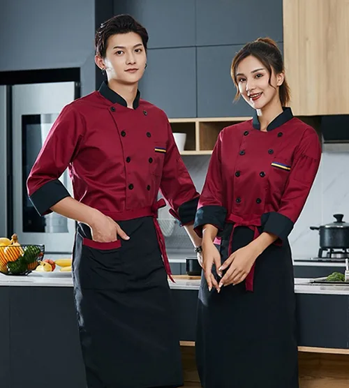 Kết luận: Đồng phục bếp nhà hàng TC-01 màu đỏ đô với thiết kế cổ trụ viền đen là sự kết hợp hoàn hảo giữa tính thẩm mỹ và công năng sử dụng. Bộ đồng phục này sẽ giúp đội ngũ đầu bếp của bạn luôn thoải mái và chuyên nghiệp trong công việc, đồng thời mang đến sự hài lòng và ấn tượng tốt đẹp cho khách hàng. Đây là một sự lựa chọn tuyệt vời cho các cơ sở ẩm thực muốn tạo dựng phong cách đẳng cấp và sự đồng bộ trong toàn bộ nhân viên.