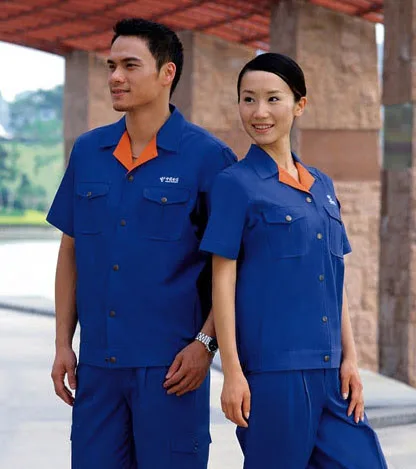 Đồng phục công nhân TC-04 sử dụng màu xanh dương làm tông màu chủ đạo, tạo cảm giác mát mẻ và dễ chịu cho người mặc. Phần cổ áo màu cam tạo điểm nhấn nổi bật, thể hiện sự năng động và trẻ trung, đồng thời giúp người mặc dễ dàng nhận diện trong môi trường làm việc. - Chất liệu: