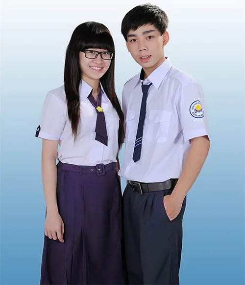 Áo sơ mi trắng được thiết kế đơn giản nhưng thanh lịch với kiểu dáng vừa vặn, phù hợp cho cả nam và nữ. Đối với học sinh nam, áo sơ mi trắng được kết hợp với quần tây, mang lại vẻ ngoài trang nhã, nghiêm túc. Trong khi đó, học sinh nữ sẽ kết hợp với váy, giúp tạo nên phong cách nhẹ nhàng, nữ tính và vẫn giữ được sự chuyên nghiệp. - Chi tiết:
