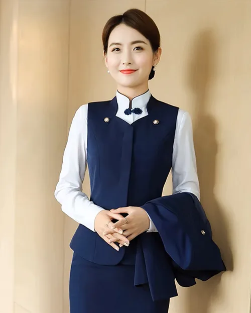 - Màu sắc: Màu xanh dương đậm thường được chọn cho đồng phục lễ tân vì tạo cảm giác chuyên nghiệp, tin cậy và sang trọng. Màu này cũng rất dễ phối hợp với các màu sắc khác.