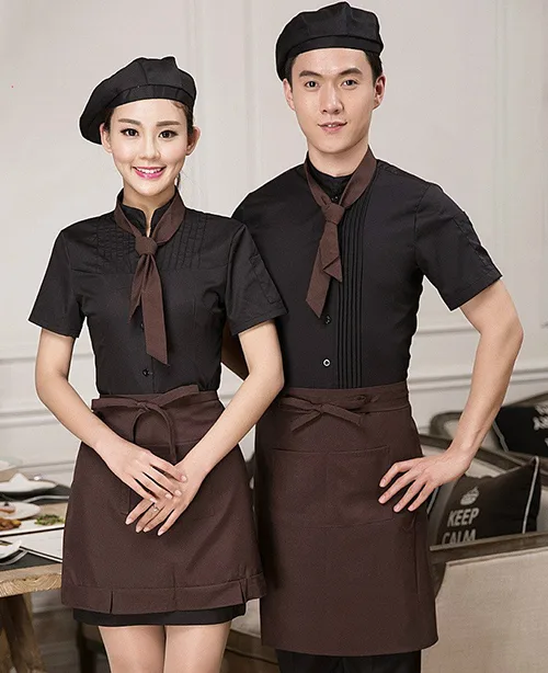 Áo sơ mi ngắn tay với thiết kế đơn giản, gọn gàng và dễ mặc. Form dáng áo vừa vặn giúp nhân viên lễ tân di chuyển linh hoạt và thoải mái khi làm việc. Tạp dề nâu đính kèm làm tăng thêm phần trang trọng và tiện ích, với khả năng bảo vệ quần áo khỏi các vết bẩn trong khi làm việc. - Chất liệu: