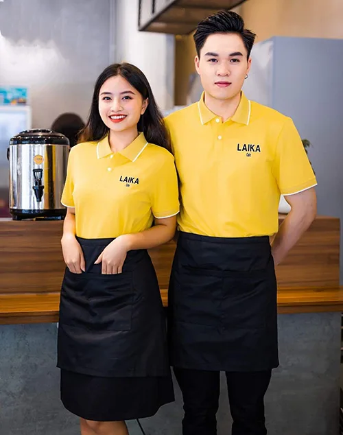 Đồng phục quán cà phê TC-02 là sự kết hợp hoàn hảo giữa sự năng động và phong cách chuyên nghiệp. Với thiết kế áo thun cổ trụ màu vàng nổi bật, viền trắng tinh tế ở tay và cổ áo cùng logo quán in nổi bật trước ngực, bộ đồng phục này không chỉ tạo sự đồng bộ trong thương hiệu mà còn thể hiện sự thân thiện và năng động, rất phù hợp với môi trường quán cà phê.