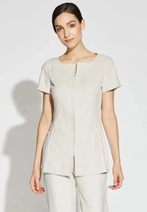 Đồng phục TC-02 mang màu trắng kem trang nhã, mang lại cảm giác thoải mái, dễ chịu cho cả khách hàng và nhân viên. Màu trắng kem không chỉ dễ phối hợp với các màu sắc khác mà còn tượng trưng cho sự tinh khiết và sạch sẽ, rất phù hợp với môi trường spa. - Kiểu dáng: